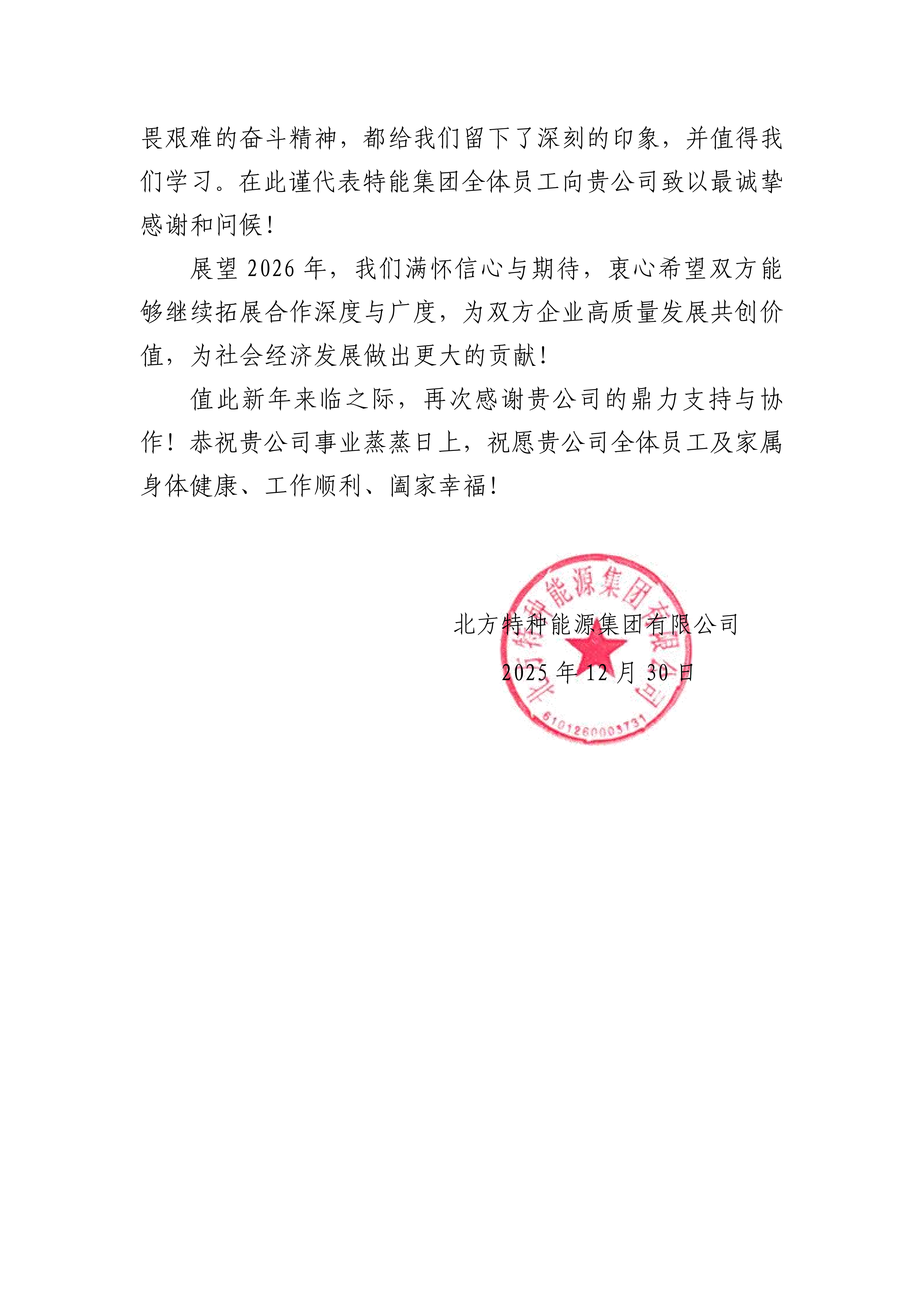 北方特種能源集團有限公司感謝信