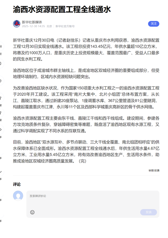 新華社重慶12月30日電(記者趙佳樂(lè))記者從重慶市水利局獲悉,渝西水資源配置工程12月30日實(shí)現(xiàn)全線通水。該工程總投資143.45億元,年供水量超10億立方米,將惠及約1000萬(wàn)人口,是重慶歷史上投資規(guī)模最大、覆蓋范圍最廣、受益人口最多的民生水利工程。