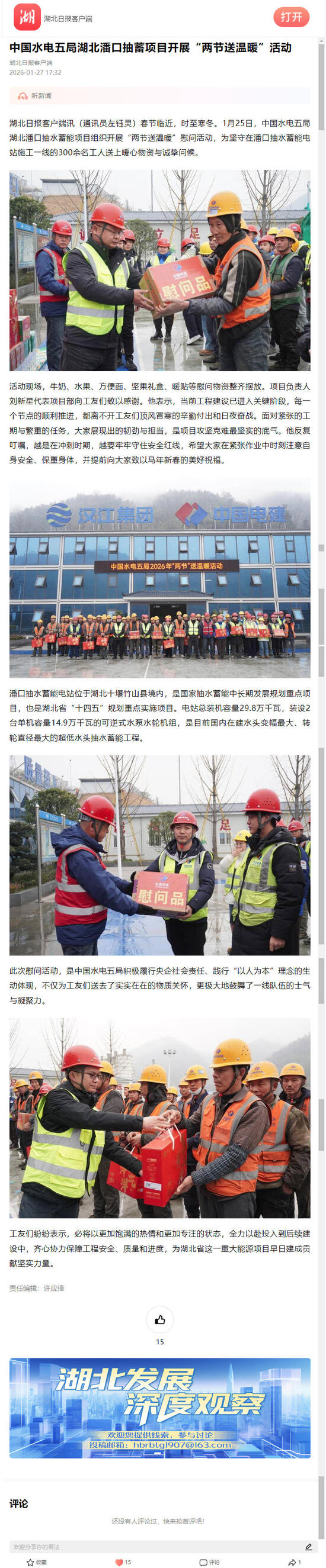 湖北日?qǐng)?bào)客戶端訊(通訊員左鈺靈)春節(jié)臨近,時(shí)至寒冬。1月25日,中國水電五局湖北潘口抽水蓄能項(xiàng)目組織開展“兩節(jié)送溫暖”慰問活動(dòng),為堅(jiān)守在潘口抽水蓄能電站施工一線的300余名工人送上暖心物資與誠摯問候。