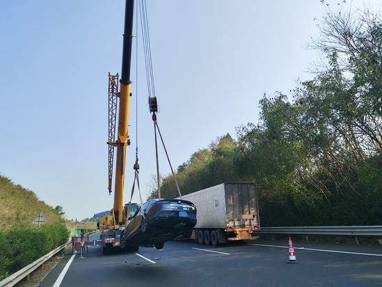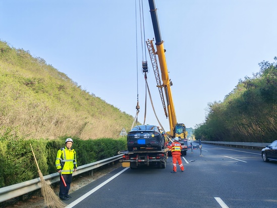 10分鐘后,高速交警與施救隊(duì)伍相繼抵達(dá)。各方迅速分工協(xié)作、高效聯(lián)動(dòng)。高速交警接手現(xiàn)場(chǎng)管控工作,優(yōu)化疏導(dǎo)方案,確保救援通道暢通;施救人員立即投入救援作業(yè),調(diào)配吊車對(duì)側(cè)翻車輛進(jìn)行穩(wěn)妥起吊與轉(zhuǎn)運(yùn)。經(jīng)過(guò)20分鐘緊張作業(yè),事故車輛被安全拖離。隨后,路巡人員快速清理現(xiàn)場(chǎng),撤除警示標(biāo)志,確認(rèn)道路無(wú)安全隱患后,該路段交通全面恢復(fù)正常。